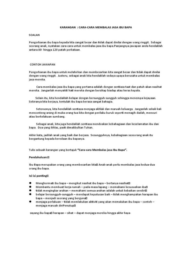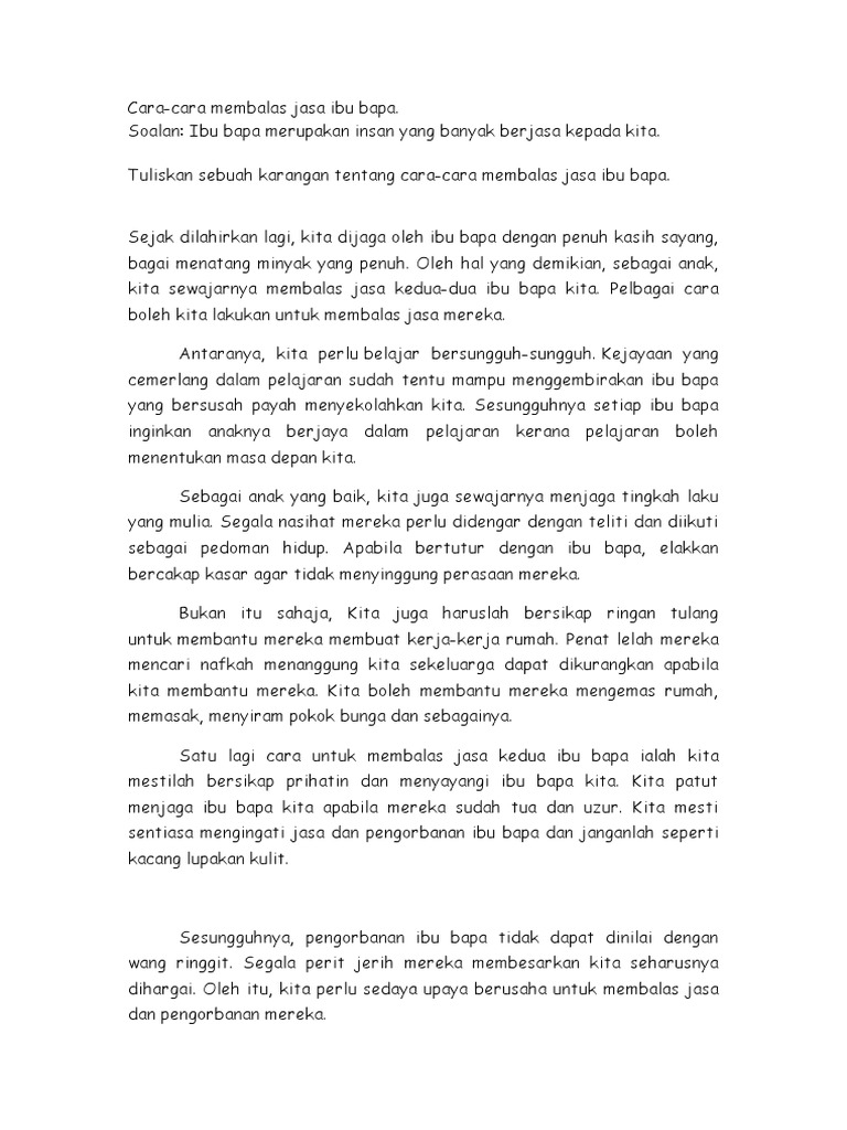 Karangan PT3Cara-cara kita membalas jasa ibu bapa. Huraikan langkah-langkah yang perlu diambil oleh anak-anak untuk membalas jasa ibu bapa mereka. Situasi sebeginilah yang sedang berlaku pada zaman ini.